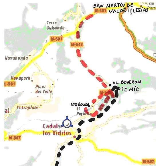 Si eliges este camino, una vez llegas a San Martin de Valdeiglesias, continuas recto dirección Ávila, y en la segunda rotonda, recto también dirección Plasencia, la siguiente rotonda, ya tiene la salida hacia Cadalso de los Vidrios (M-542). Una vez en la carretera, continuas recto, hasta una señal amarilla Picadero Los Boxer, y ahí se da la vuelta hacia atrás porque la entrada está en el otro sentido.